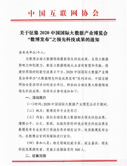 關(guān)于征集2020中國國際大數(shù)據(jù)產(chǎn)業(yè)博覽會(huì)<br /> “數(shù)博發(fā)布”之領(lǐng)先科技成果的通知