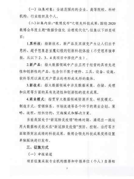 (二)征集內(nèi)容:“數(shù)博發(fā)布”之領(lǐng)先科技成果,圍繞2020數(shù)博會(huì)年度主題“數(shù)據(jù)價(jià)值化 治理現(xiàn)代化”,征集以下四類項(xiàng)目:
