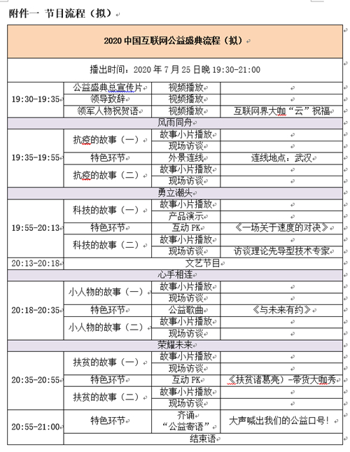 在本屆互聯網大會主題的大框架下,公益盛典將暫定分為四個段落,分設為四個主題:分別是“風雨同舟”“勇立潮頭”“心手相連”“榮耀未來”,與之相對應的是——中國互聯網行業(yè)在本次抗疫中的表現、年度政策導向及技術創(chuàng)新、行業(yè)發(fā)展中的小人物大情懷、值得期許的未來等四部分內容(擬定流程見附件一)。